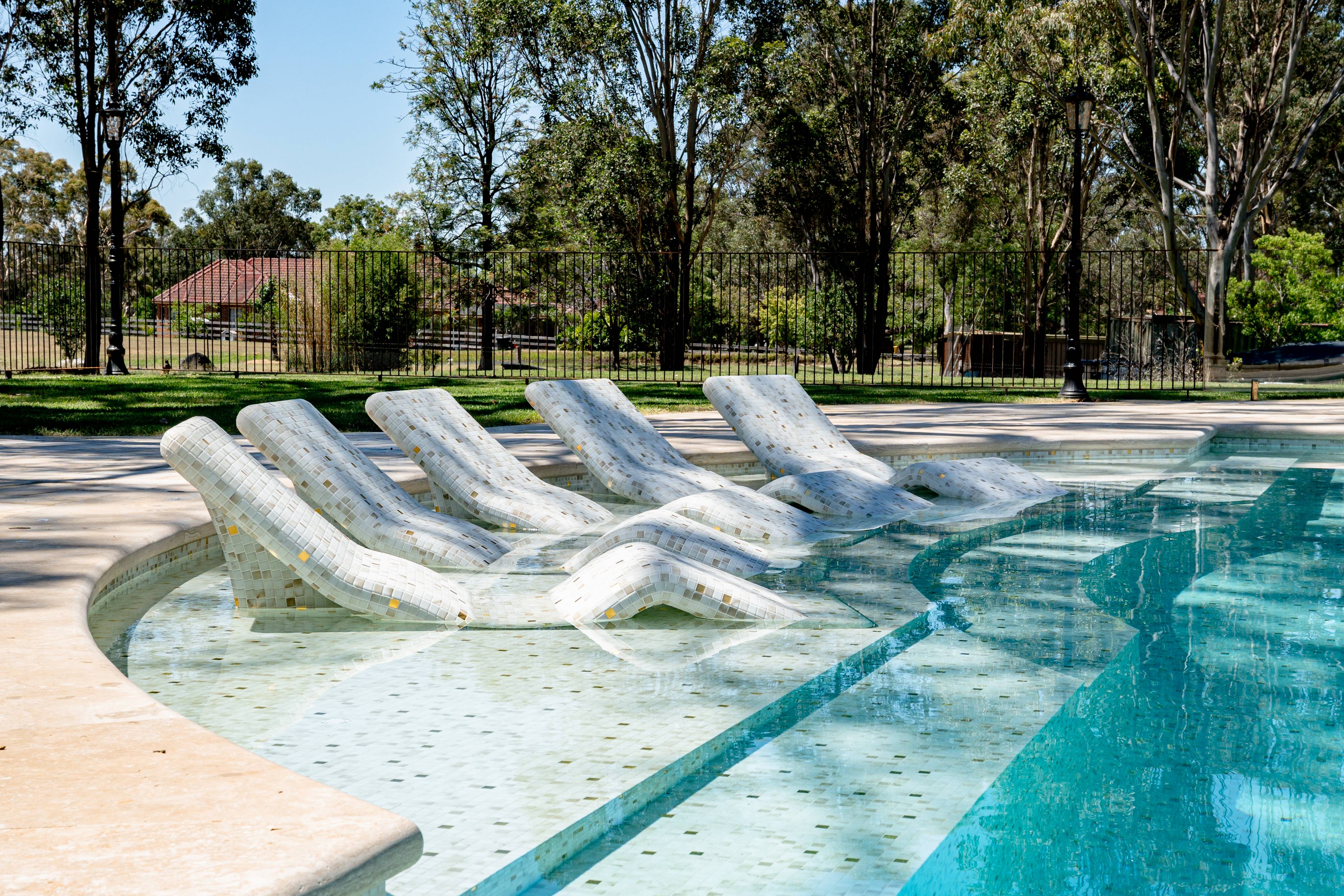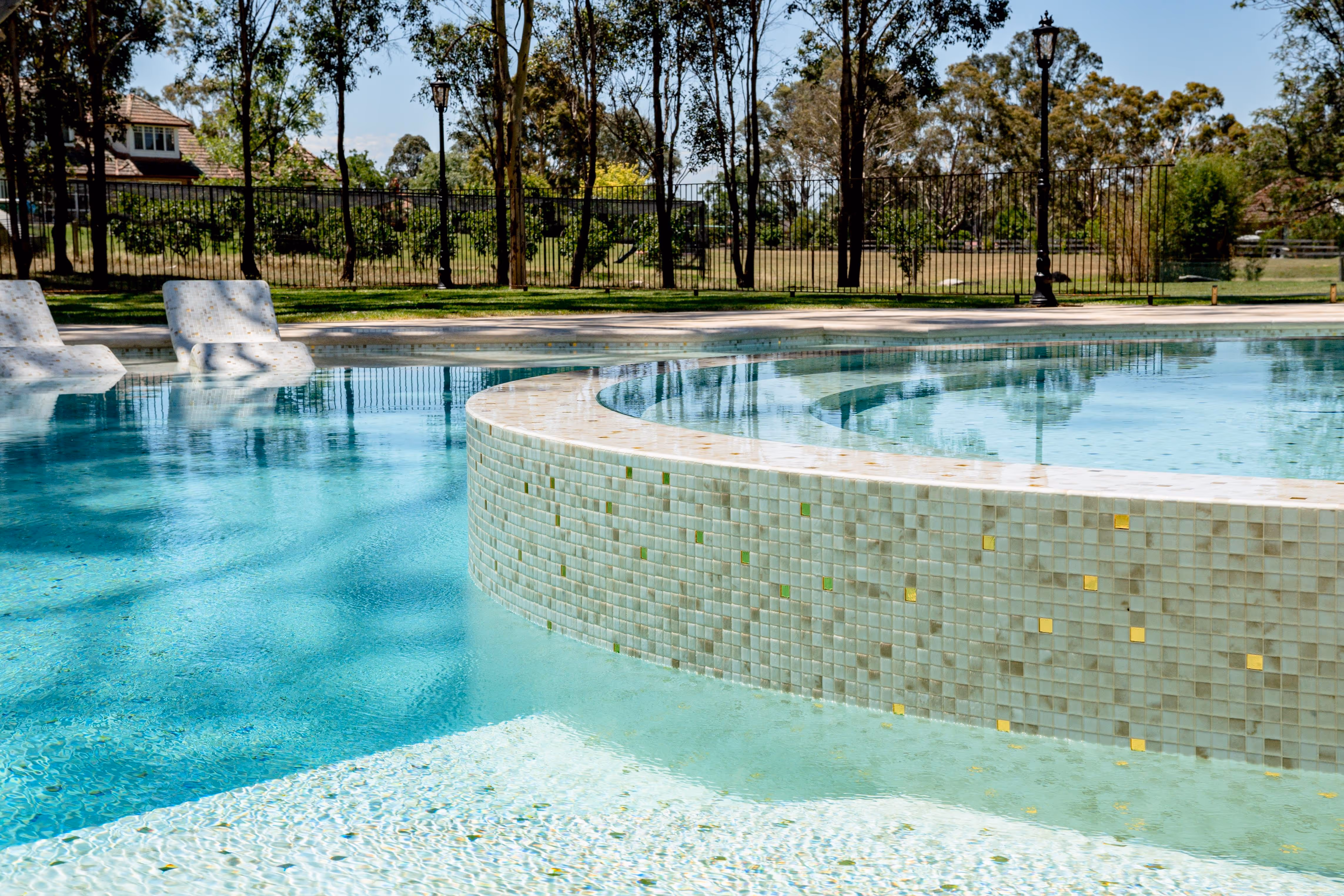 A true Midas touch, this standout project features the striking Sponge Gold Ezarri mosaic as its hero, delivering warmth, depth and unmistakable presence. Custom curved Natural Stone Travertine supplied by Europe Imports frames the design with precision, while fully tiled German made sun lounges add a bespoke architectural statement. Every element has been carefully considered and executed using the highest quality materials, resulting in a poolscape that is unapologetically high-end and refined in detail.