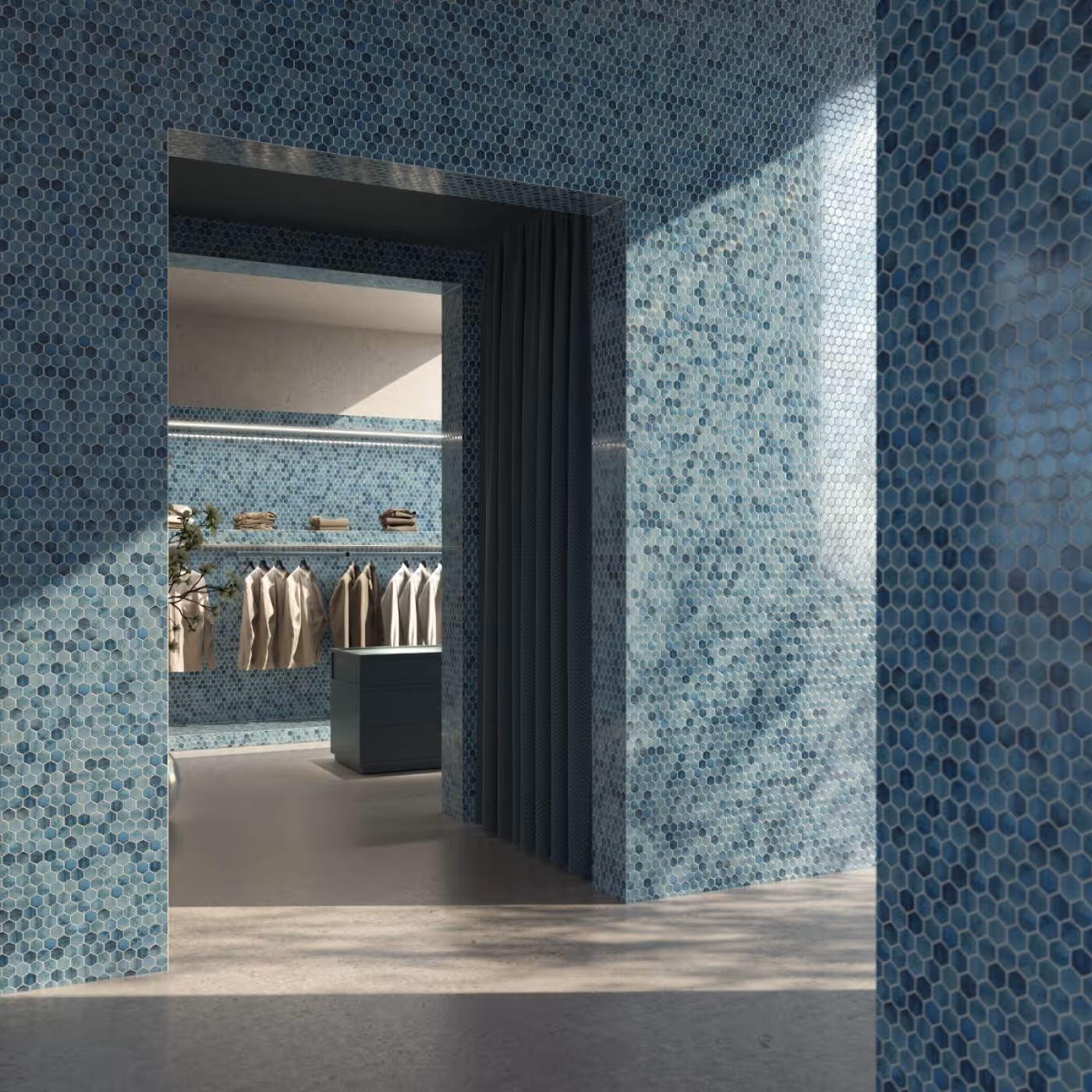 Moonstone from the Gemma collection, is a glossy mosaic in a bluish-gray tone, especially suitable for interior cladding, pools, spas, saunas, and wellness spaces. Inspired by Gemma Mengual.