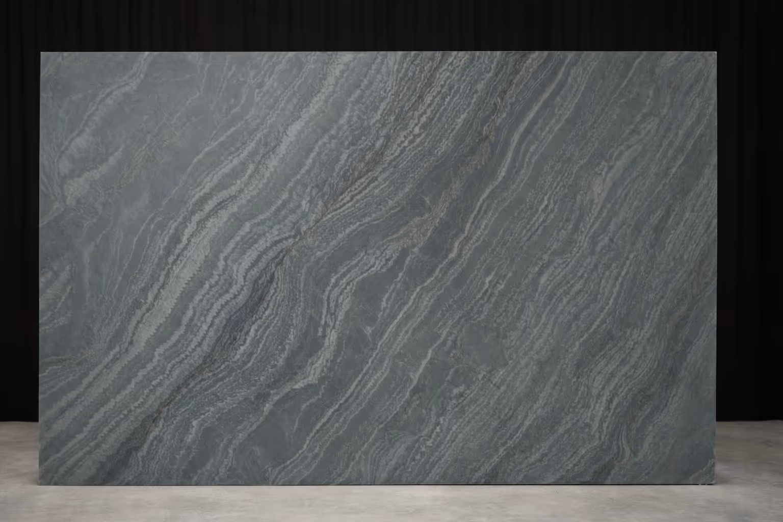 Green Maestro is a Brazilian quartzite defined by a deep green base layered with flowing linear veining in soft sage, grey and muted mineral tones. The stone displays dynamic movement with moderate contrast, creating a striking architectural surface suited to large-format walling, bathroom interiors and kitchen benchtops. Supplied in honed 20mm slabs, Green Maestro quartzite supports cohesive slab compositions across residential and hospitality interiors where expressive natural stone surfaces are desired. As a natural quartzite, sealing is recommended and natural variation between slabs is expected.