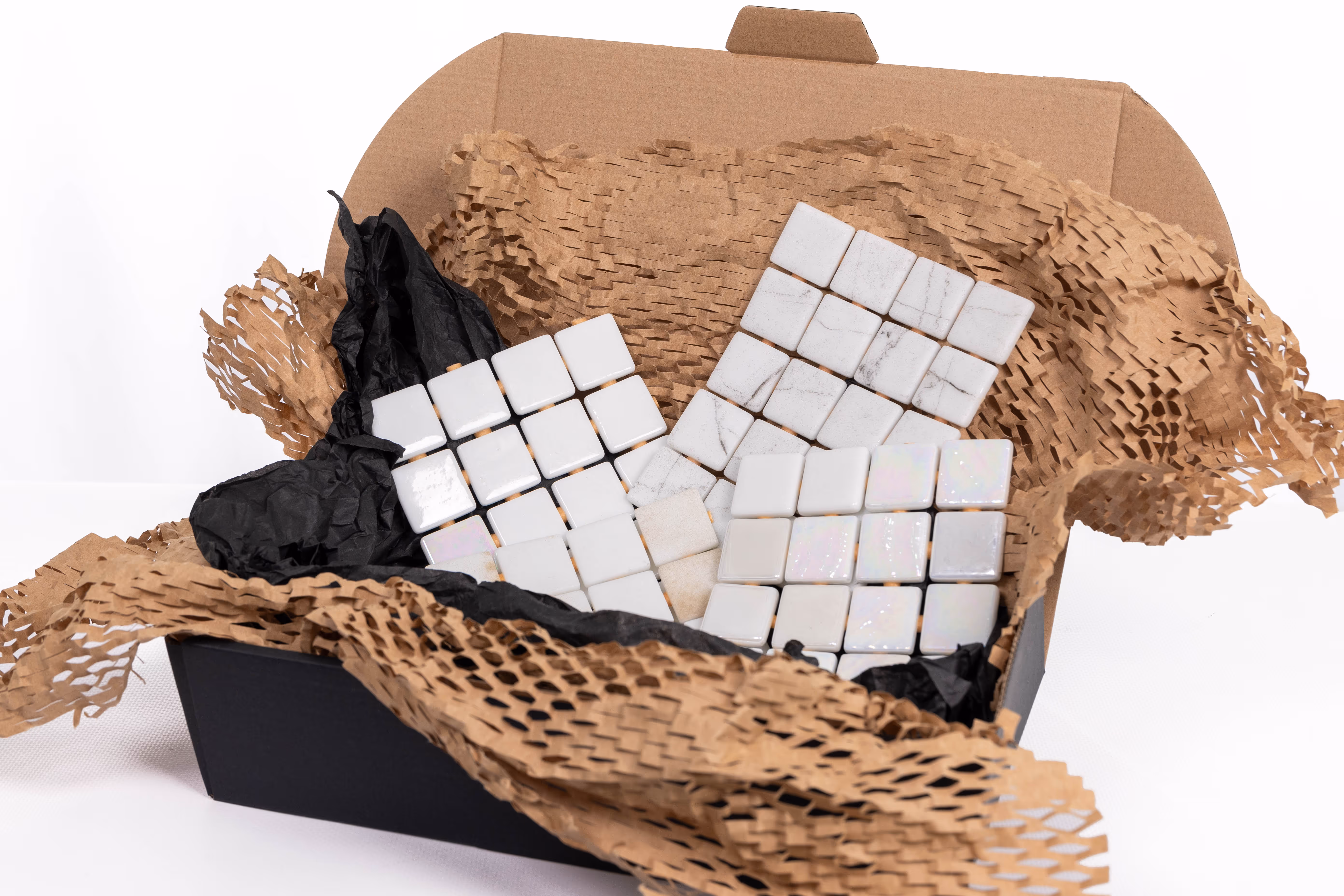 The Europe Imports Sample Boxes are designed to safely package and present mosaic and tile samples. Each box neatly holds a curated selection of tiles, allowing materials, colours, and finishes to be easily viewed and compared. Ideal for sending samples or presenting product selections, these boxes provide a simple and professional way to showcase tile collections.